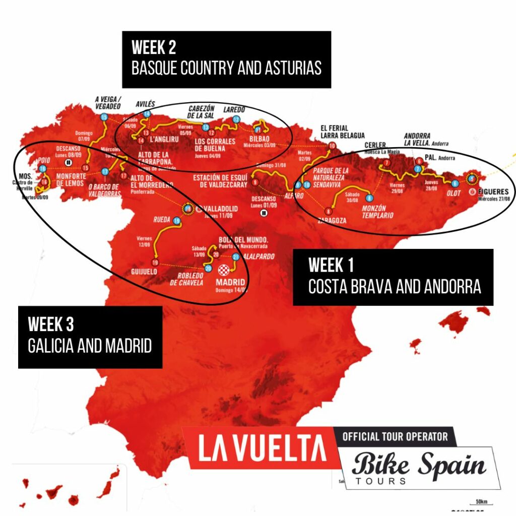 - Week 1: 25th – 31st AugustThe first week of La Vuelta 2025 takes us to the cycling paradise of the Costa Brava! We’ll enjoy some spectacular cycling in the Cap de Creus, before heading into the Pyrenees and crossing the border into the mountaintop Principality of Andorra. We’ll have a quick spin through through the famed wine country of Somontano de Barbastro before finishing in the Aragonese capital of Zaragoza.
